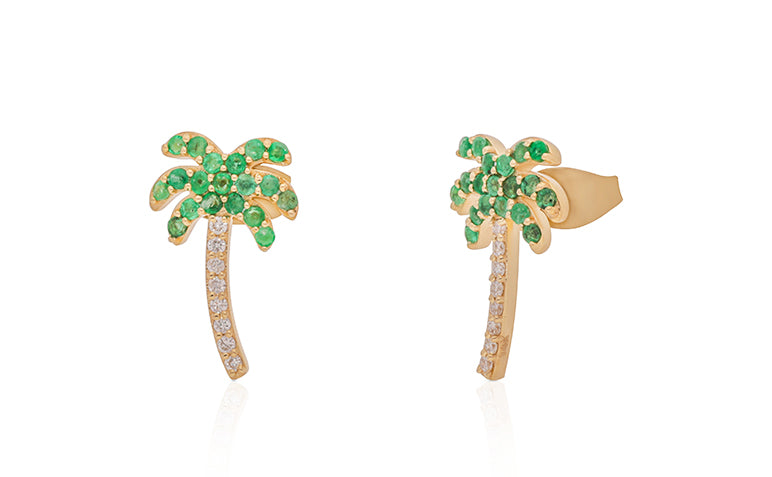 Imagine the lush, vibrant leaves of a palm tree, transformed into a dazzling pair of solid gold studs. The Palm Tree Studs are nothing short of a masterpiece, meticulously crafted with emerald palm leaves that dance in the light. The trunk, a solid sculpture in gold, is studded with diamonds, creating a striking contrast that captures the essence of spring's rejuvenation. These studs are not just accessories; they are a stylish nod to the beauty of nature, reminiscent of sun-filled days and peaceful, palm-lined vistas. These studs are perfect for those who seek to make a statement of luxury and love for nature, embodying the lush landscapes that spring brings to life.